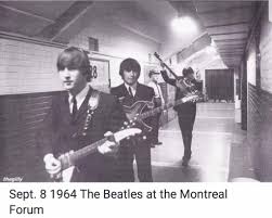 The Beatles , en plein dans la Beatlemania du début des sixties, donnèrent deux concerts au Montréal Forum. Comme les choses étaient rondement menées en ce temps là, les anglais jouèrent deux fois le même jour, le 8 septembre 1964, avec l’obligation, en plus des performances scéniques, de satisfaire aux questions d’une conférence de presse. Les interviews eurent lieu directement sur la scène, retransmises par la radio canadienne CBC. Pas vraiment convaincus par la venue des Beatles, certains reporters locaux firent, dit-on, circuler des remarques désobligeantes sur le groupe adeptes des franges tombantes sur le front et que le public local attendait en masse ( 21000 spectateurs!) . Plus préoccupant des indépendantistes canadiens proférèrent des menaces sur le groupe ce jour là et particulièrement sur Ringo Starr qui reçut des menaces de mort. On se demande bien pourquoi? Résultat, les musiciens qui avaient déjà joué à Vancouver et Toronto, se sentirent plutôt nerveux pendant leur prestation… Immédiatement après le set donné en soirée, The Beatles reprirent un avion pour Key West où d’autres fans hystérisés les attendaient aux aurores sur le tarmac de l’aéroport… Après une pause à Miami les quatre de Liverpool prirent un autre vol pour Jacksonville au nord de la Floride , y donnant un show le soir suivant.