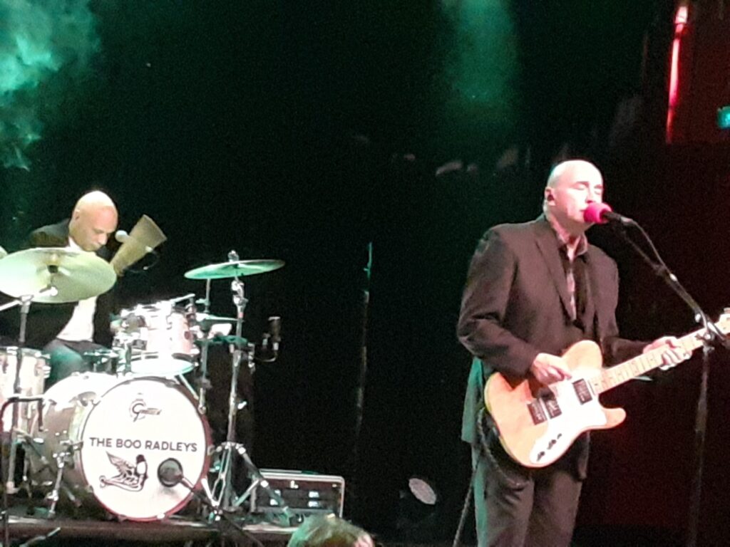 La set list du concert gardois, qui suit celui de Béthune la veille, est composée de titres de toutes les périodes du groupe. Sice l’annonce au micro, souriant, après une entrée en scène scénarisée avec bande son un peu solennelle qui fonctionne bien . Le groupe attaque par « Come On Kids », puis « Up On 9th and Fairchild ». On attend « Wake up Boo! » et on est conquis. Entrée d’un musicien additionnel aux cuivres qui rend l’ensemble encore plus joyeux. « Ride the Tiger » est archi convaincant. A ce stade je me dis que la formation s’est bonifiée en live. The Boo Radleys jouent bien et font passer ce qu’ils ont à nous dire désormais. « What’s in a box » et « Wish I was Skinny » sont toniques pour le premier et pop liverpuldienne à gimmick pour le second.